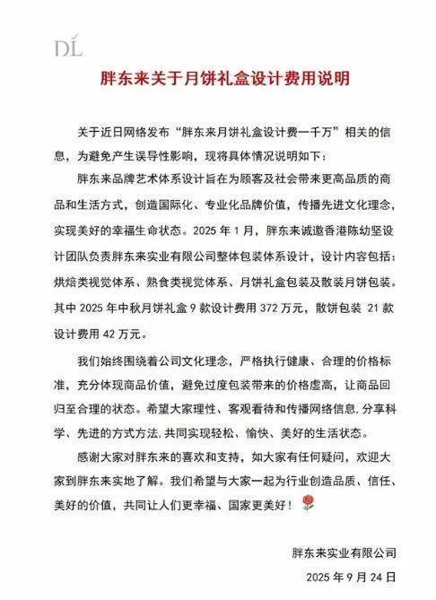 近期,“胖东来月饼礼盒设计费一千万”的传言闹得沸沸扬扬,9月24日,胖东来发布声明回应称:“2025年1月,胖东来诚邀香港陈幼坚设计团队负责胖东来实业有限公司整体包装体系设计,设计内容包括:烘焙类视觉体系、熟食类视觉体系、月饼礼盒包装及散装月饼包装,其中2025年中秋月饼礼盒9款设计费用372万元,散饼包装21款设计费用42万元。”